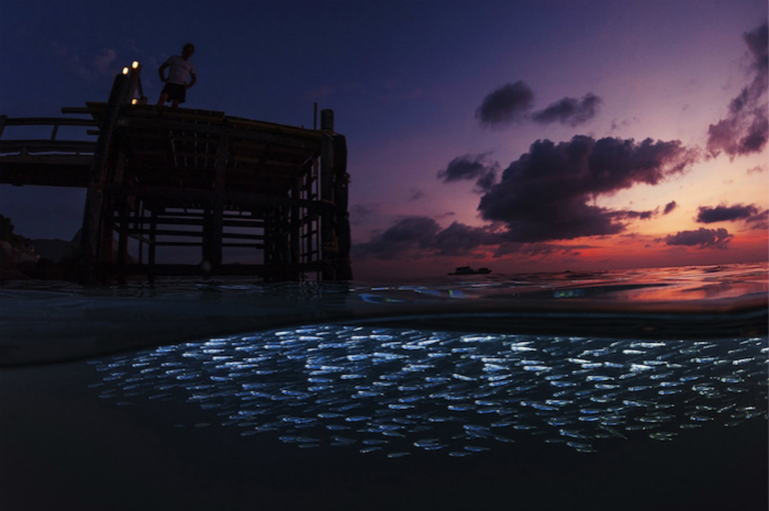 “找到这个地点之后,码头和银河鱼构成的画面就在我脑海中挥之不去。所以当季风雨短暂停歇时,我赶紧跳入水中拍摄照片。我遇到的主要障碍就是鱼群会避着鱼眼镜头,而且太阳下落得太快了。所以,我只能调整设备,并且做好努力会付诸东流的心理准备。忽然,一群鲹悄然而至。这简直完美,银河鱼蜂拥而上前去捕食,从而忘记了我这个摄影师。此时,一个路人走过那里,刚好站在码头上。看到这个时机,我让他别动,迅速按下快门。”