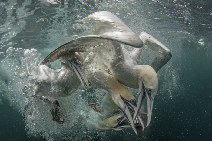 “拍照的时候,我正在海上为‘苏格兰:如画’项目拍照。这个项目的主题是回归野生状态,致力于刻画苏格兰的野生景观。我们在船的周边抛出鱼作为诱饵,引得上百只塘鹅围绕过来。忽然,一只鸟潜入水中,把其他鸟引了过来,瞬间三四十只鸟也潜入水中。这一行为使得塘鹅也潜了下来,为这种鱼大打出手。当我拍下照片前,我真切地听到了头顶上的鸟拍打水面的声音。”