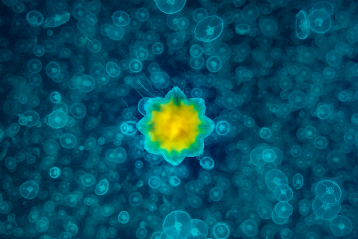 “去年夏天,我前往阿拉斯加寻找鲑鲨(salmon sharks,又名太平洋鼠鲨),我们坐在船上寻找它们的背鳍,找了好几个小时。这时,我们看到一个巨型的海月水母爆发,延展了好几百米。密集的水母爆发深达2米-20多米。我们在水中观察了很久。这比我之前见过的任何爆发都要密集,和帕劳的水母湖相比都有过之而无不及,太神奇了!后来,我看到这只狮鬃水母从爆发的底部升上水面,于是我游到它的正上方拍下这张照片。”