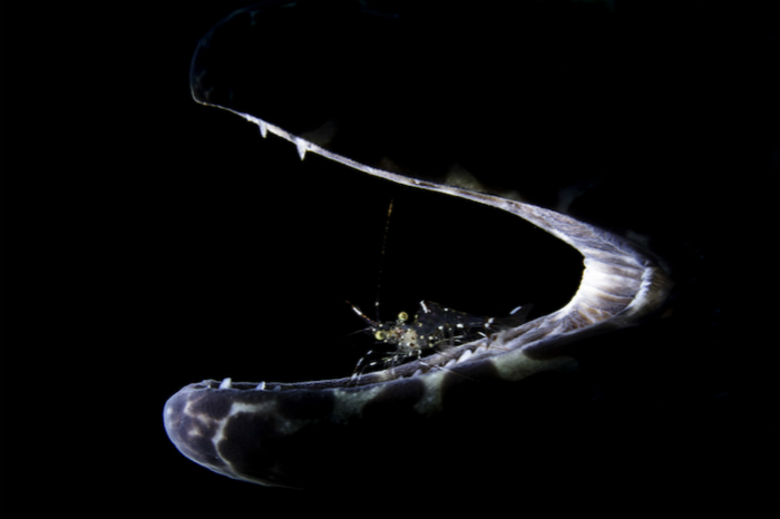 “我在26米深的水域发现了这个清洁场。第一次潜水时,我从正面拍了几张海鳝嘴中的清洁虾。当我准备升回水面时,灵光一闪,何不拍一张海鳝的侧面照呢?这样我可以同时拍下海鳝宽大的嘴巴与齿间的清洁虾。于是,我下潜了第二次,拍出了理想的照片。”