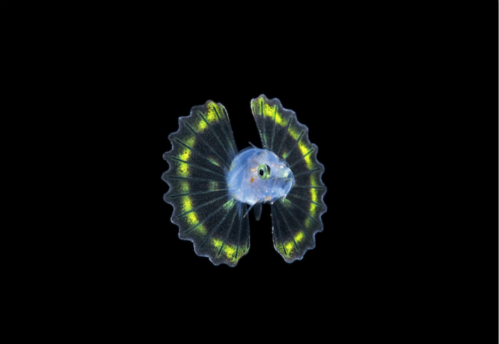 “这张照片摄于我在佛罗里达州的棕榈滩的黑水水域漂流潜水的时候。当时我在寻找外观奇特、刚刚开始发育的远洋动物、浮游生物等,它们通常在开放海域漂流。这些生物不仅非常小,而且当我用明亮的潜水灯照射时,它们溜得很快。因此,拍到好的照片不仅具有挑战性,而且让人十分有成就感。有一次潜水时,我幸运地看到这个稀有、渺小的年幼狮子鱼,更为幸运的是,当它在镜头前张开美丽的双鳍时,我拍下了这一幕。”