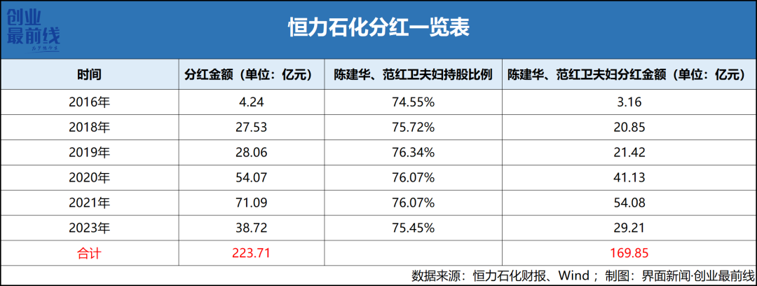 登陆上交所至今的8年时间里,恒力石化有6年进行了分红,累计分红金额高达223.71亿元。按照陈建华、范红卫夫妻的持股比例计算,二人合计分走了169.85亿元。