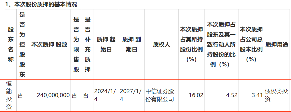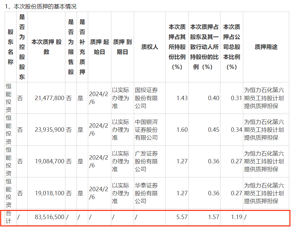 除此之外,恒力集团的一致行动人恒能投资也在质押公司股份。2月6日,恒能投资累计质押8351.65万股公司股份;1月4日,恒能投资质押2.4亿股公司股份。