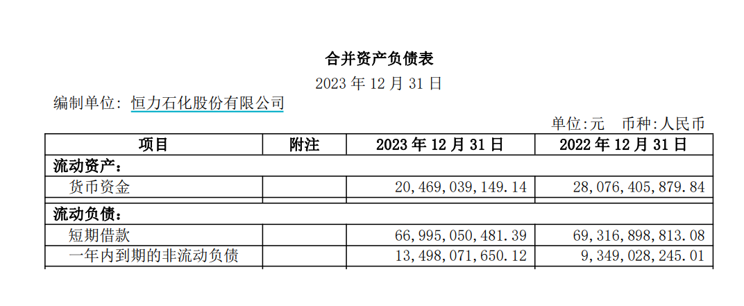 截至2023年12月31日,恒力石化的短期借款、一年内到期的非流动负债分别为669.95亿元、134.98亿元。同期,其货币资金仅有204.69亿元,远远无法覆盖这些短债,短债缺口高达600.24亿元。