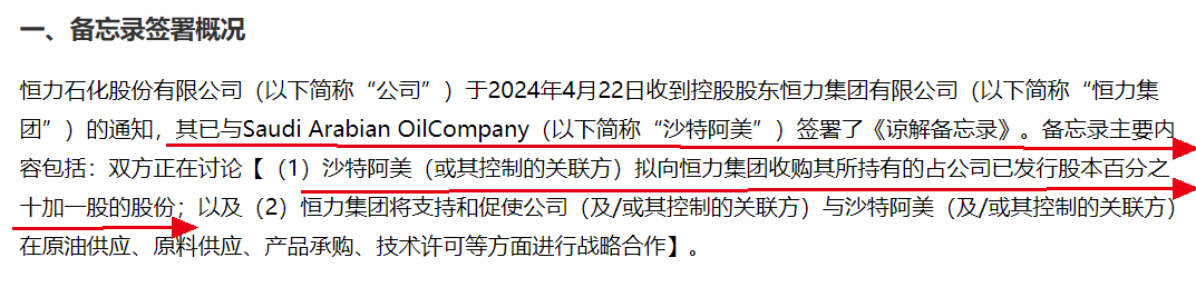 4月22日,恒力石化发布公告称,恒力集团已与Saudi Arabian OilCompany(以下简称“沙特阿美”)签署了《谅解备忘录》,双方正在讨论沙特阿美(或其控制的关联方)拟向恒力集团收购恒力石化10%加一股的股份。
