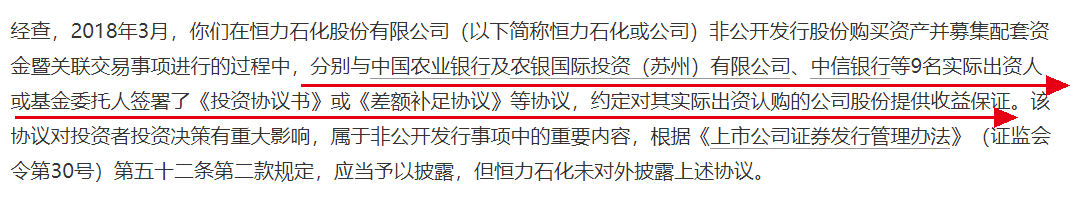 具体而言,2018年3月,控股股东恒力集团及实控人陈建华、范红卫在公司非公开发行股份购买资产并募集配套资金暨关联交易事项进行的过程中,分别与农银、农银国际投资(苏州)有限公司、中信银行等9名实际出资人或基金委托人签署了《投资协议书》或《差额补足协议》等协议,约定对其实际出资认购的公司股份提供收益保证。