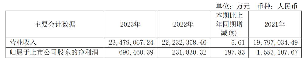 财报显示,2023年,企业实现营业收入2347.91亿元,同比增长5.61%;归母净利润69.05亿元,同比增长197.83%。