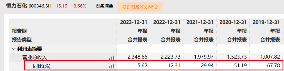 从中不难看出,恒力石化的营收增速在近5年一直呈现下滑趋势,2023年更是首次出现个位数。