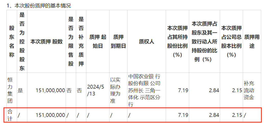 5月15日,恒力石化发布公告称,控股股东恒力集团质押1.51亿股股份,是为融资提供质押担保,本次质押后,恒力集团及一致行动人累计质押11.39亿股,占其所持股份的21.46%。