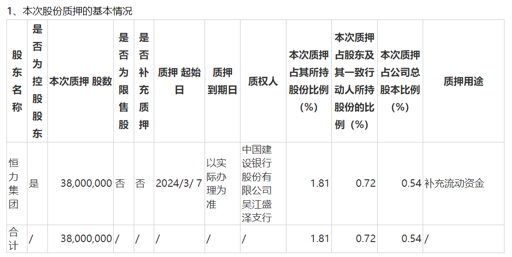 据创业最前线不完全统计,3月7日,恒力集团质押3800万股公司股份;1月29日,累计质押2340万股;1月5日,质押3000万股。