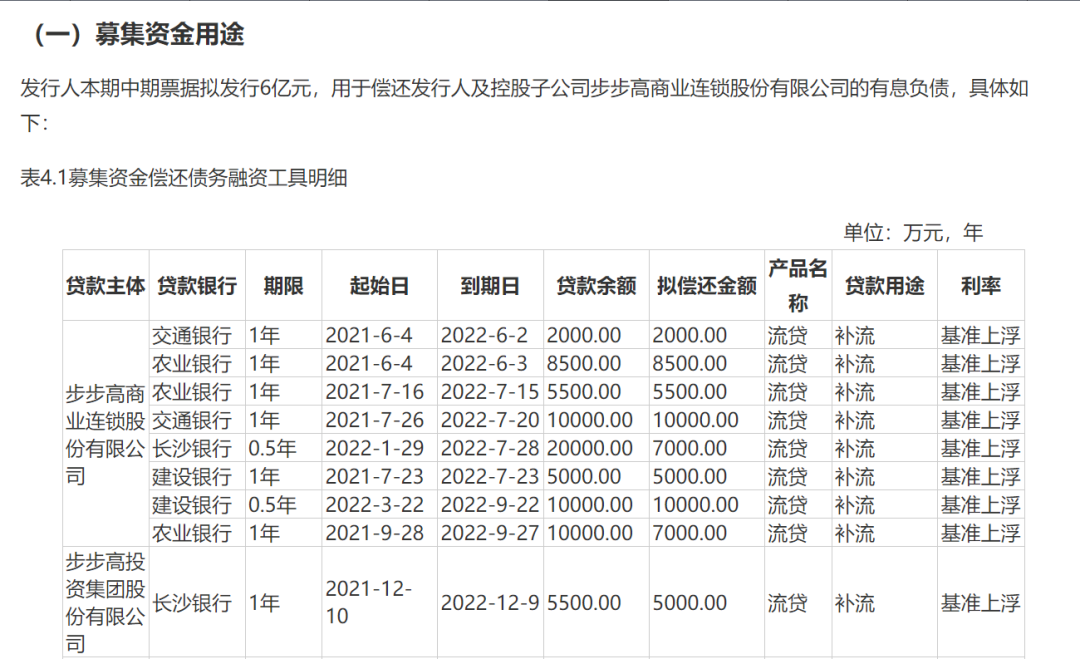 这笔中期票据,是步步高集团于2022年5月27日发行的,规模6亿元,票面利率7.5%,期限为2+1,到期日2025年5月30日。据中期票据募集资金用途显示,主要用于偿还步步高集团及子公司步步高的有息负债,从资金明细看,大头5.5亿元是拿去给步步高还债的。
