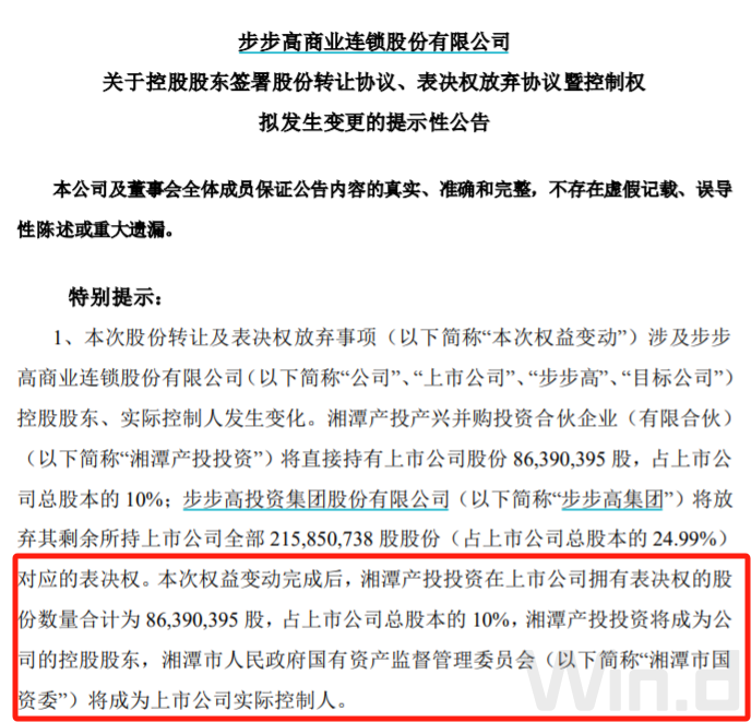 湘潭产投投资主要出资方为湘潭电化产投控股集团有限公司,由湘潭市国资委全资所有。股份转让后,湘潭产投投资持有8639万公司股份,占步步高总股本的10%。步步高集团放弃剩余23.06%公司股份对应的表决权,湘潭产投投资成为步步高控股股东,湘潭市国资委成为公司实际控制人。