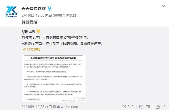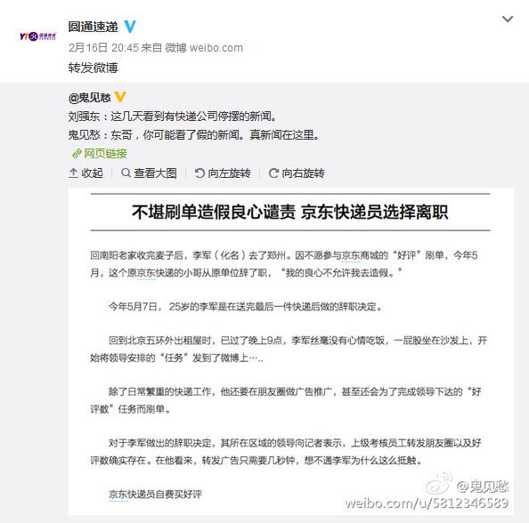 然而,所谓的“快递公司停摆”不过是媒体的误传,圆通、百世随后作出回应,称公司整体运转正常,对对报道失实的媒体追究法律责任。圆通和天天快递更是通过官方微博转发“不堪刷单造假良心谴责 京东快递员选择离职”的内容,对刘强东进行还击。、