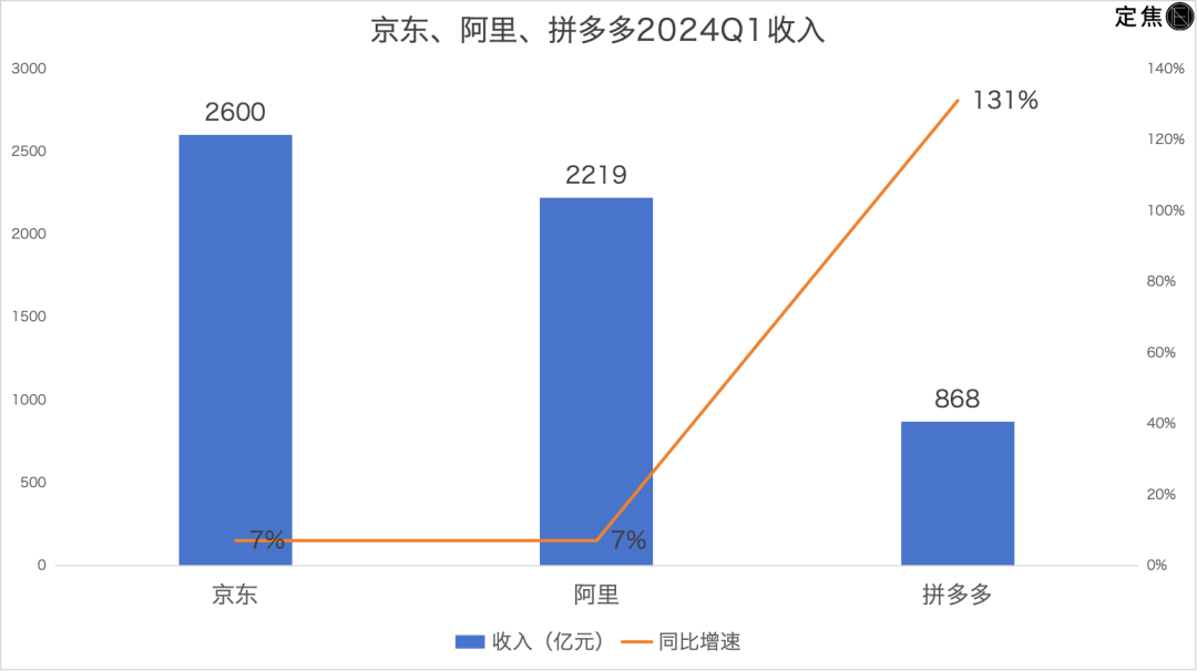 对比阿里巴巴、京东和拼多多三家电商巨头2024年第一季度财报(其中阿里为2024财年第四财季,对应自然年2024年1-3月),「定焦」得出了一些结论: