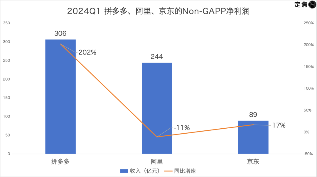 再看利润规模,拼多多、阿里、京东三家的调整后净利润依次为306亿元、244亿元、89亿元。