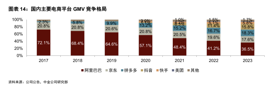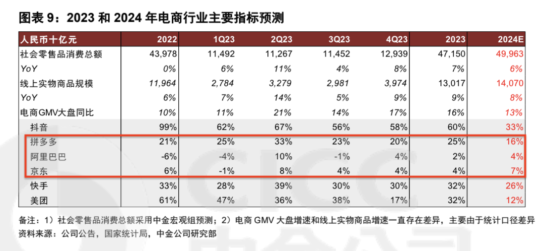 根据中金公司研报中电商平台的GMV增速和格局变化,「定焦」计算出三家2023年的GMV体量大致为,阿里8万亿、拼多多3.7万亿、京东3.6万亿。