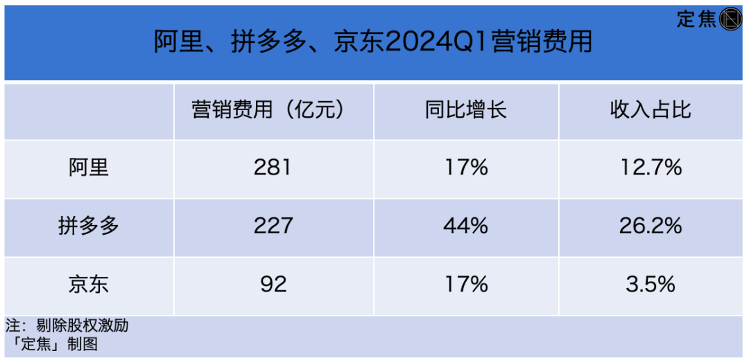 从剔出股权激励的费用来看,阿里、京东和拼多多一致是对外适当花、对内拼命省。