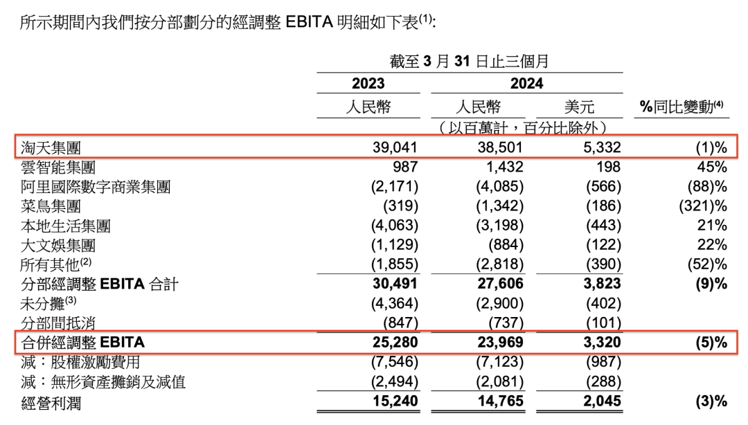 阿里各分部的经调整EBITA