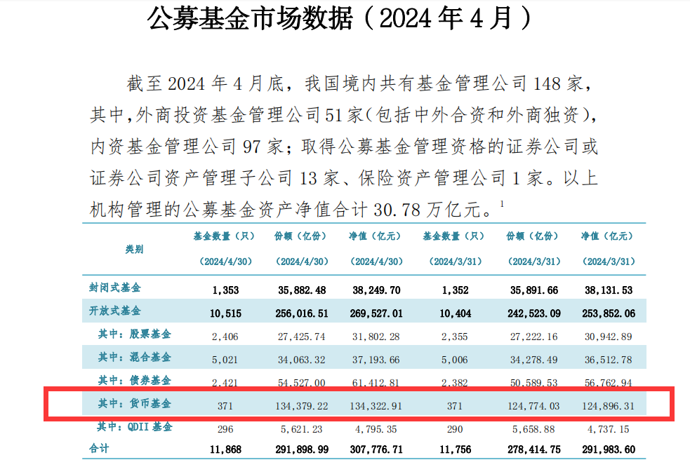 据新经济e线了解,居民存款搬家是导致公募货基规模飙升的关键因素。上述中基协数据也表明,截至今年4月末,公募货币基金规模超过13万亿元,达13.43万亿元,较今年3月末的12.49万亿元,单月环比激增9426.6亿元,环比增速达7.55%。今年4月,货币基金规模增长净额位列各类产品之首。同期,全行业当月新增规模近1.58万亿元,环比增长5.41%。