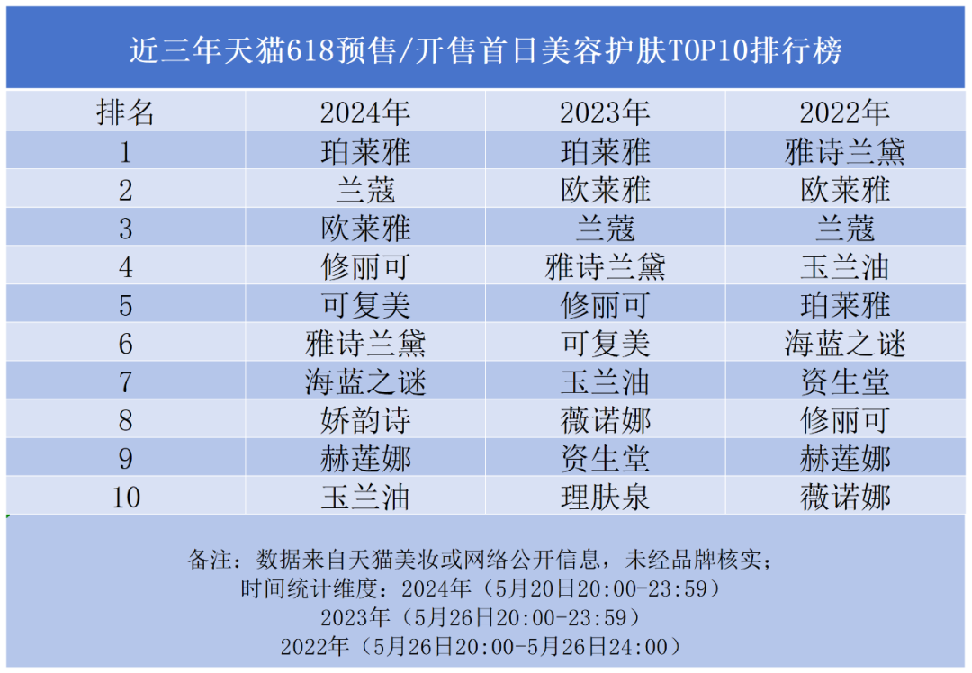 另一霸榜巨头是雅诗兰黛集团,今年旗下的雅诗兰黛和海蓝之谜两大品牌均上榜。不过,雅诗兰黛排名出现显著下滑。2022年-2024年,雅诗兰黛的排名分别为TOP1、TOP4、TOP6。