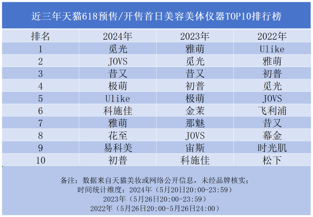 国际品牌在这一赛道集体显出颓势。如雅萌、初普等一度引发消费潮流的美容仪品牌,2024年均出现显著下滑。其中,雅萌从2023年的TOP1下滑至今年的TOP7,初普从2022年的TOP3下滑至今年的TOP10,宙斯则在去年上榜之后,今年已不见踪影。