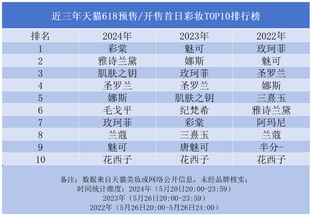 值得关注的是,近三年,彩妆类目前三席的角逐十分激烈。2022年-2024年,一共有8个品牌曾短暂冲上TOP3宝座,但无一品牌连续上榜。唯一连续2年登上TOP3的玫珂菲,今年则掉至TOP7。