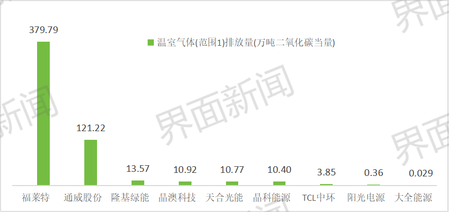 据界面新闻统计,在温室气体排放数据披露方面,除特变电工外,九家企业均对报告期内范围一温室气体排放量、范围二温室气体排放进行了披露;对于范围三温室气体排放量数据,特变电工、大全能源、福莱特三家企业未披露。