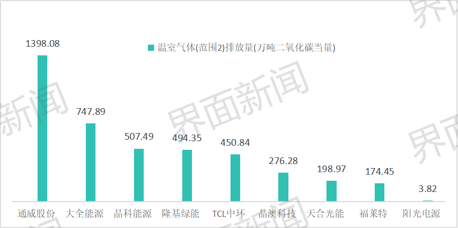 对于范围二温室气体排放量,排放量居前二的企业分别是通威股份和大全能源,排名三、四的分别是晶科能源和隆基绿能。