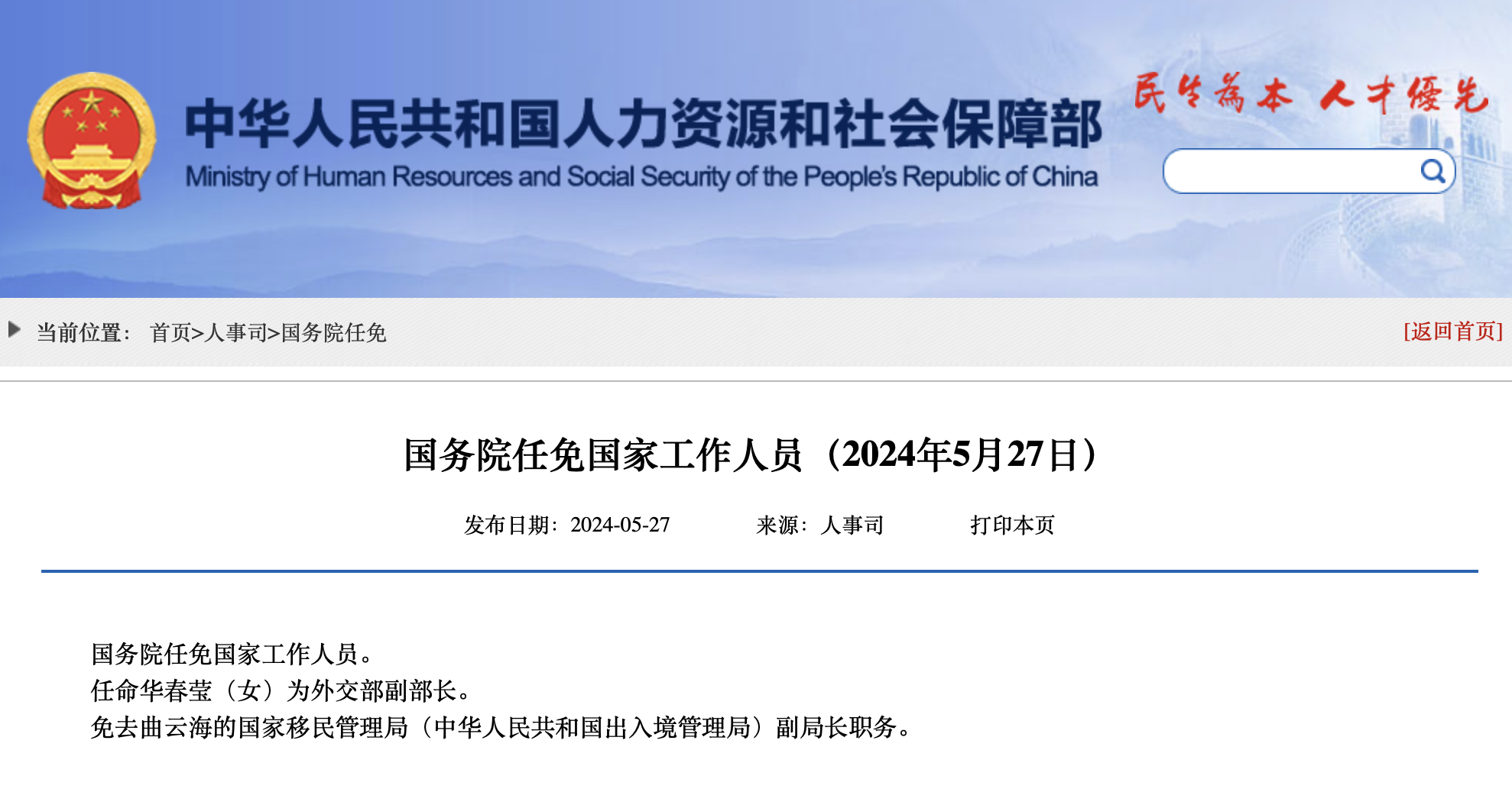 据人社部网站5月27日消息,国务院任免国家工作人员。