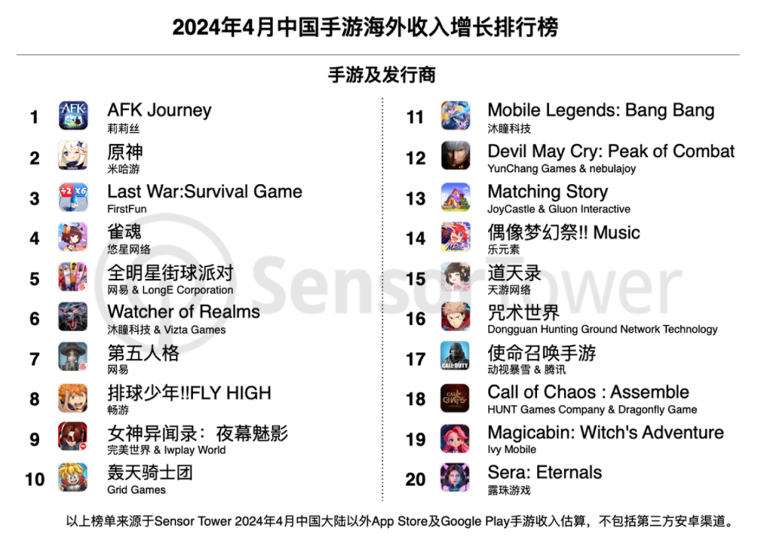 近日,第三方机构SensorTower发布了2024年4月中国手游产品在海外市场收入及下载量排行榜,一款名为《AFK Journey》的手游空降收入榜第10位,并成为当月的海外收入增长冠军。
