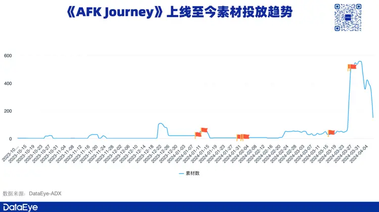 DataEye-ADX数据显示,《AFK Journey》在去年10月底就开始进行素材投放,但日均投放素材并不多。待到今年3月底游戏正式上线前后,《AFK Journey》单日投放素材数突然迎来直线提升。
