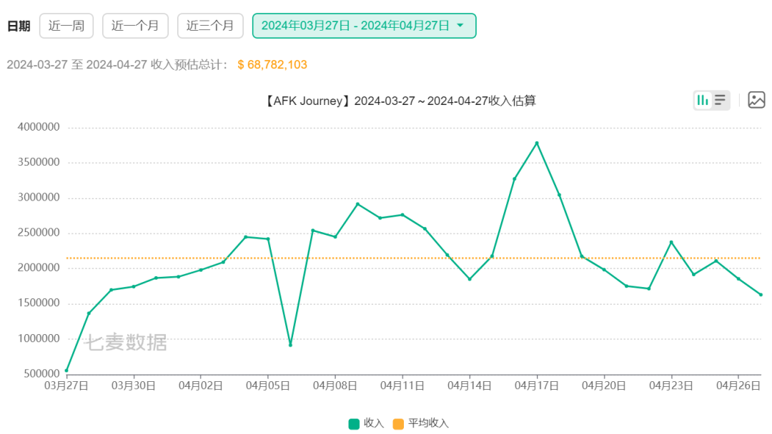 七麦数据显示,截至2024年4月27日,《AFK Journey》在欧美市场iOS端累计收入预估达到6878.21万美元,约合人民币4.81亿元。此外,如果计算上Android端,那么《AFK Journey》上线首月的收入已超5亿元。