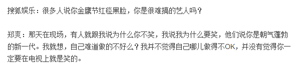别人问她为什么不笑,她语出惊人:“我为什么要笑?”将心情写在脸上,将疑问直白地问出,或许真的很傻很单纯,可这也是最真实的郑爽吧。谁也说不清红毯上那些笑容满面的艺人究竟带着多少层面具呢。