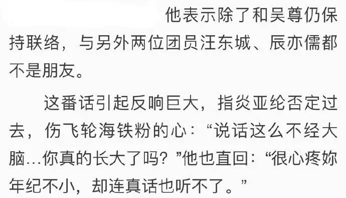 但这样在意别人眼光的郑爽可能不知道:太过于赤裸裸的真实与被大众认可本身就是一件矛盾的事。说到这里迷死氧想起之前炎亚纶在回应飞轮海成员关系时说过的一句话:心疼你年纪不小,却连一句真话也听不了。
