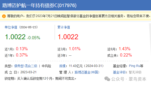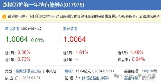 据天天基金网,截至今年5月16日,产品净值为1.0064,近一年收益为0.73%,同期中证全债指数录得6.11%的收益。截至2024年3月31日,该基金A份额的规模为15.04亿元。