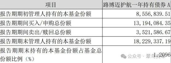 截至2024年一季度末,路博迈使用自有资金持有的上述产品份额,占基金总份额比例为1.2096%。
