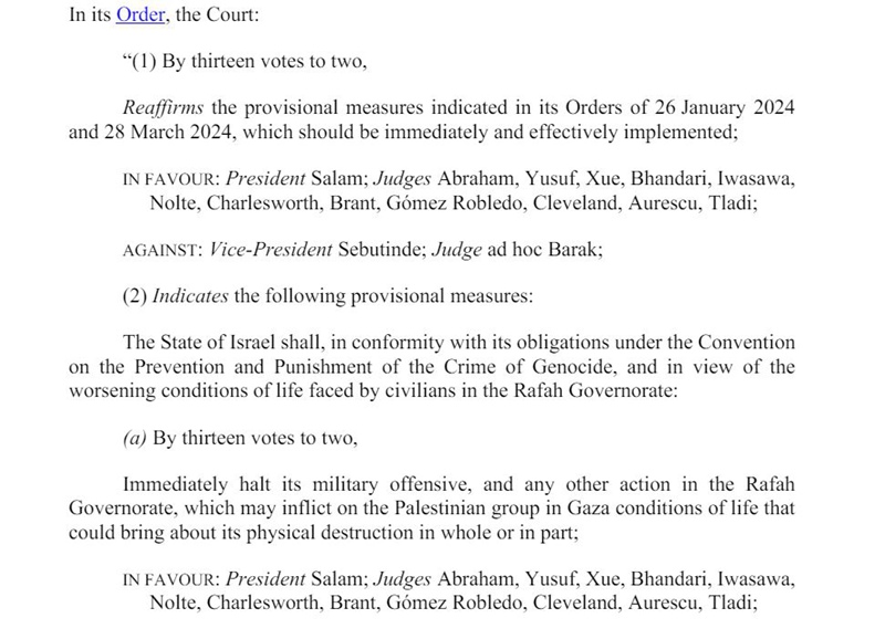 裁决还要求以色列确保拉法口岸开放,让急需救援物资得以运入加沙并确保联合国机构能不受阻碍进入加沙对种族灭绝指控进行调查。