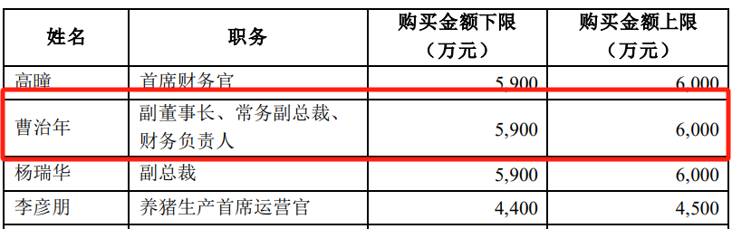 此次增持对于众多高管而言,涉及金额普遍较高。以牧原股份副董事长、常务副总裁、财务负责人曹治年为例,此次增持曹治年拟增持金额为5900万元至6000万元。