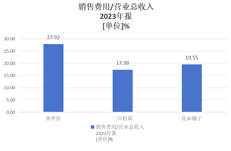 不仅如此,来伊份在销售费用上投入成本高,但回报甚微。以2023年为例,来伊份、三只松鼠、良品铺子的销售费用占营收比例分别为27.92%、17.39%、19.55%。可见,营收表现处于行业中下游的来伊份,销售费用率却是“老三家”中比例最高的。