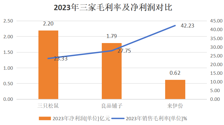 首先,在和良品铺子、三只松鼠的对比中,来伊份毛利率最高,但净利润却排名倒数。