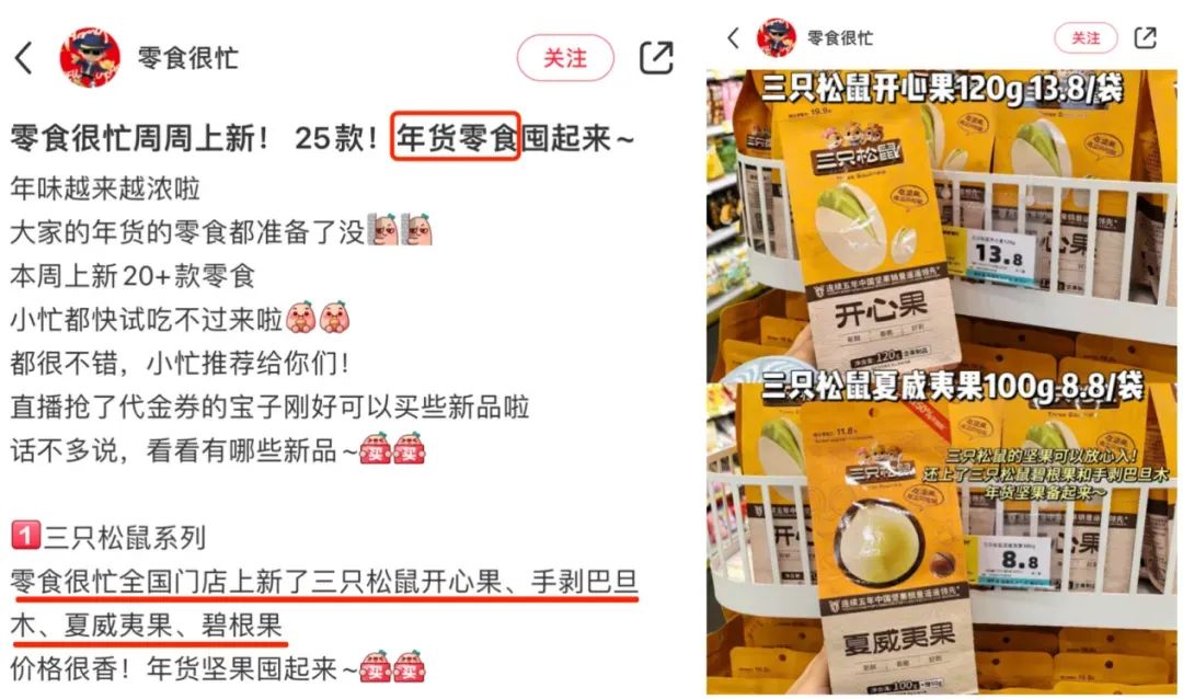 那么,基于对三只松鼠品牌力、知名度优势的认可,零食很忙引入三只松鼠品质单品,不仅能够丰富产品多样性,还能助力渠道品质升级。