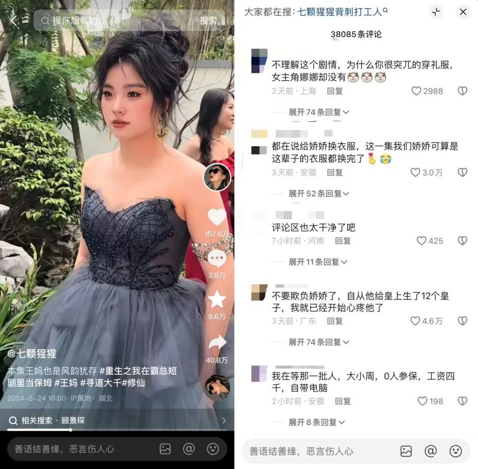 不久前还被称为“打工人最强嘴替”、凭借《重生之我在霸总短剧当保姆》系列全网涨粉300万的王妈@七颗猩猩,以一种“资本家”的姿势意外地塌房了。