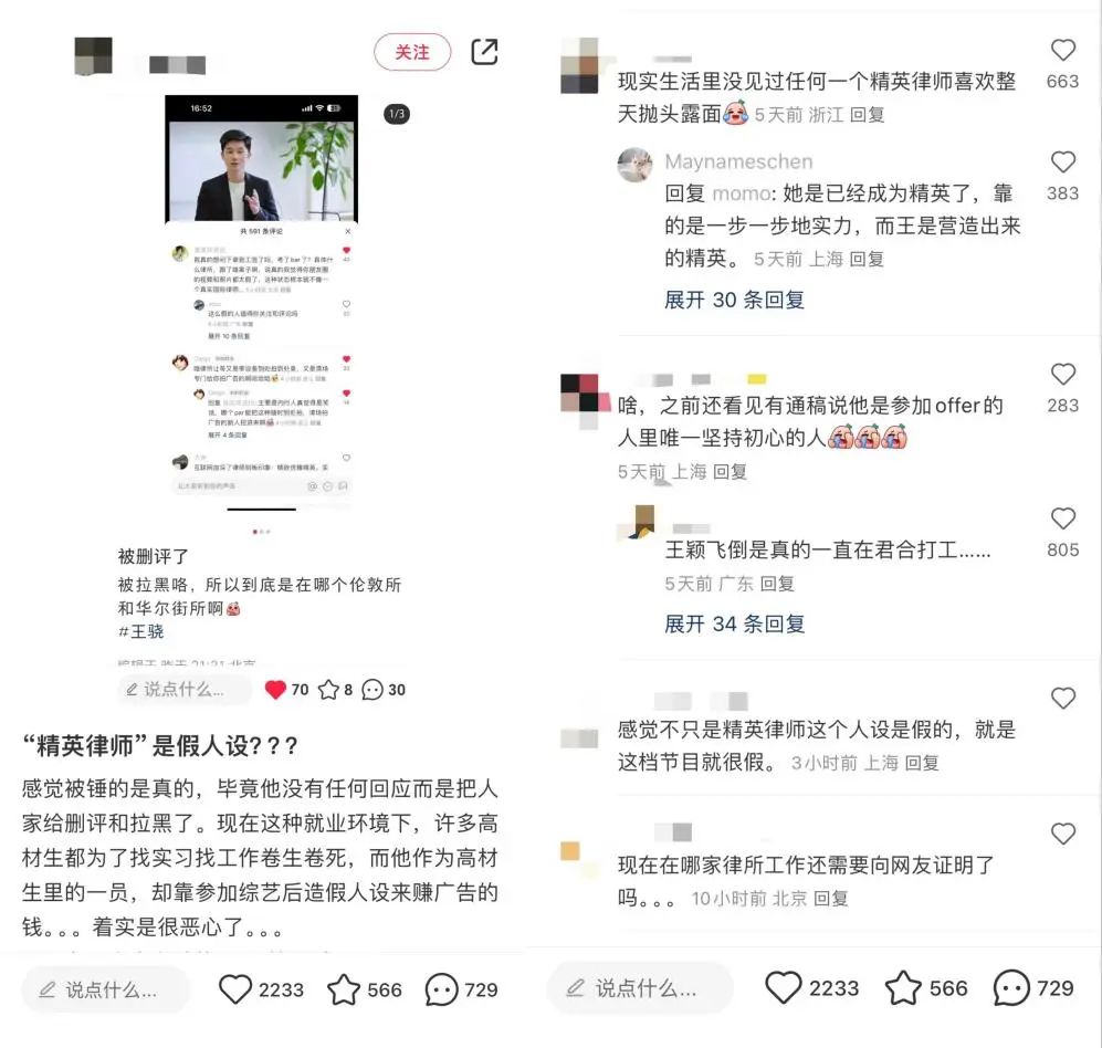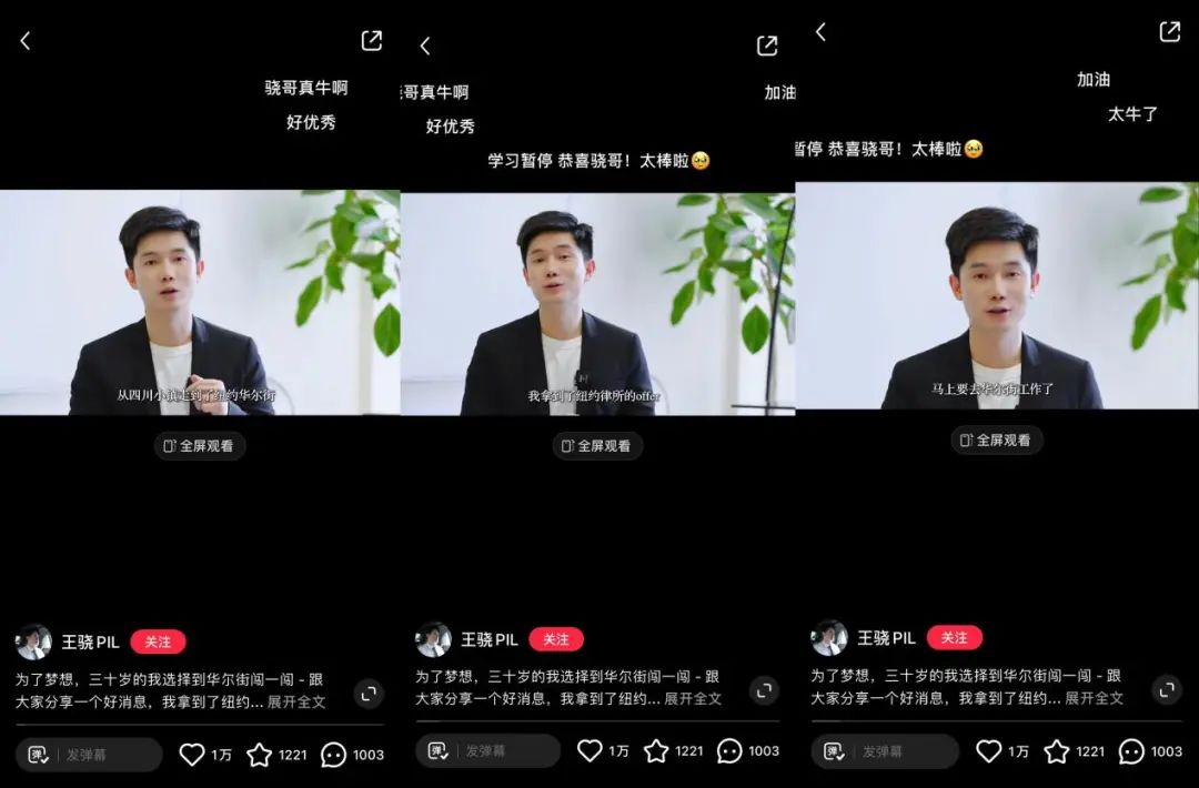 近期,另一博主也深陷人设争议。前阵子,在《令人心动的offer》被大众认识的王骁发布了一则视频,表示“自己拿到了纽约律所的offer,马上要去华尔街工作了,继续做国际仲裁。”