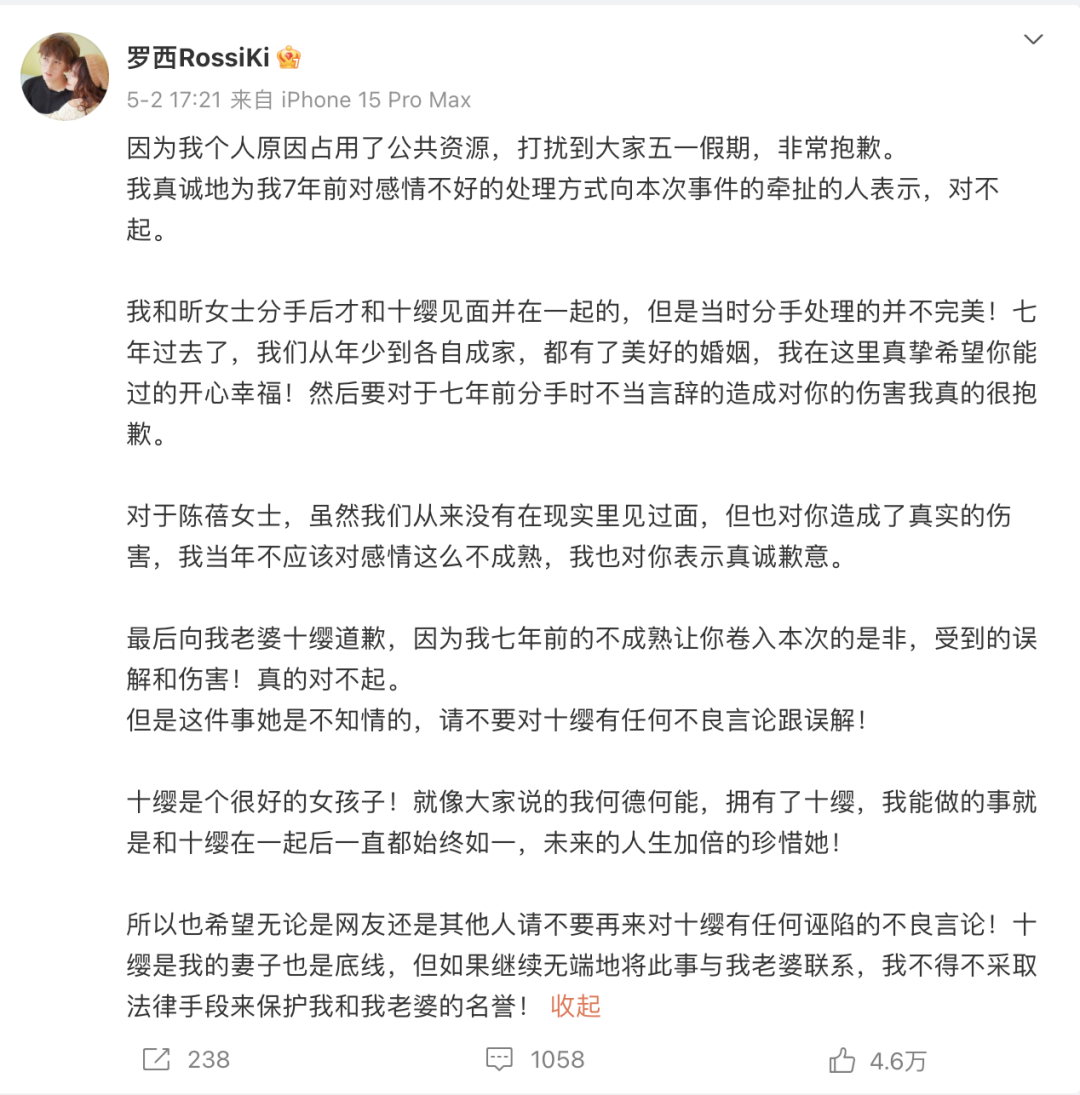 前阵子,千万粉丝的网红情侣博主@罗西和@临界十缨,男方@罗西被前女友爆出脚踏三只船,舆论压力之下,罗西不得不出面道歉。当互联网上呈现出甜美爱情故事,变成纠缠不清的现实伦理剧时,完美宠妻人设瞬间崩塌实际上是渣男时,很多粉丝都表示“到底什么是真的呢,网络中那么相爱,却只是三选一”,并喊话罗西“给我道歉”。