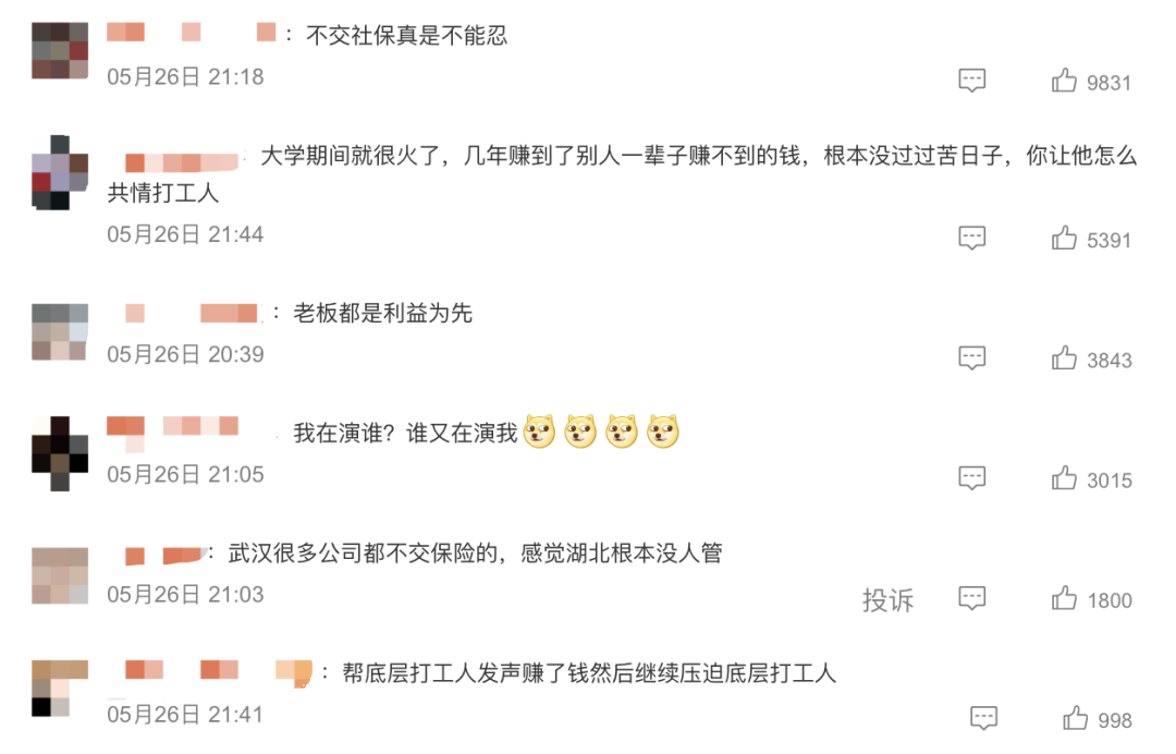 5月26日,#王妈公司待遇#、#王妈公司0人参保#等话题轮番登上热搜。网友纷纷质疑,“吃着打工人的红利,结果自己只给打工人四千“、“为何要利用我的苦难赚取我的流量,回头来压榨千千万万个我?”