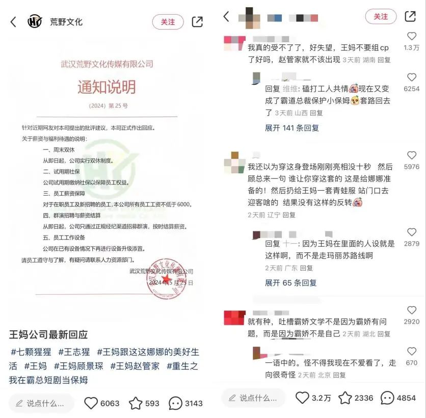 针对各个争议点,荒野文化也陆续给出了回应,否认了“0人参保”、“抄梗”,并发布了关于薪资与福利待遇的说明,但依旧挡不住来势汹汹的口碑崩塌。