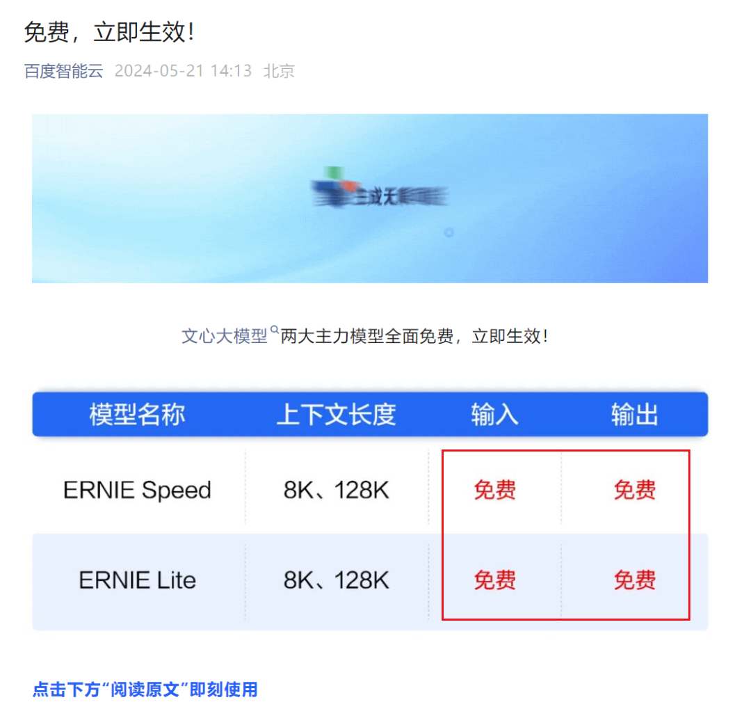 然而仅仅数小时后,百度智能云却直接宣布文心大模型两大主力模型全面免费,且立即生效。