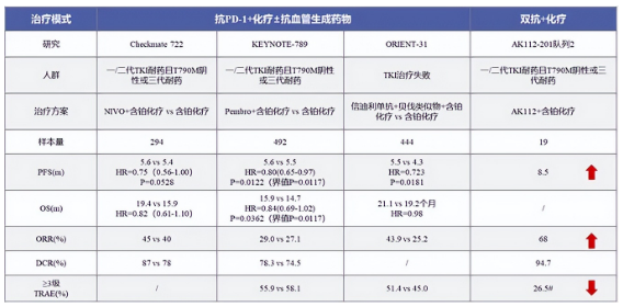 并且,相较于其它潜在竞争对手,AK112也并不弱。当时,EGFR TKI耐药领域发表了三项Ⅲ期研究结果,主要是PD-1+化疗+抗血管生成的联合疗法。