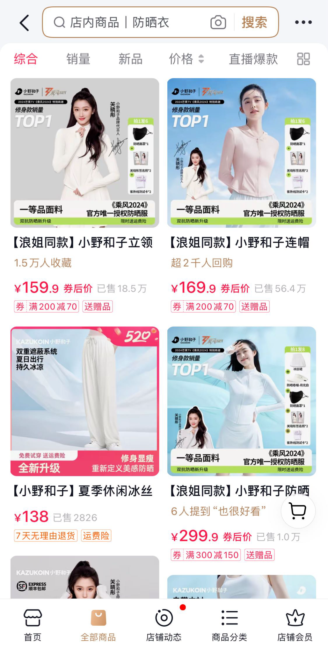 值得一提的是,在这些新品牌的商品结构中,有不少是为带货主播上架设置的专属链接,如果除去这部分重合的商品,品牌基本只有50-100余个产品在售。这些品牌虽然从属于运动户外分类,但产品范围狭窄,品类非常集中,春夏季节主要以销售防晒衣为主,秋冬季则主卖光腿神器。