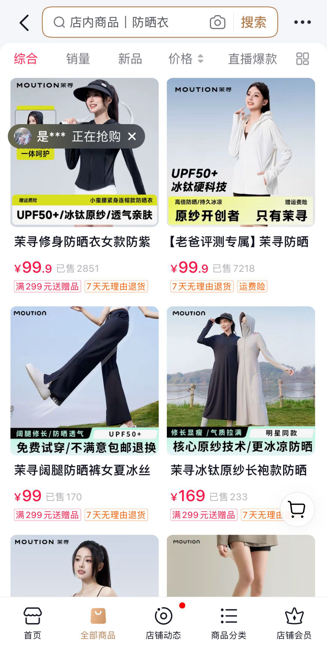 防晒衣和光腿神器都具有一定的功能性,消费者往往是因为产品的防晒、仿真性能购买,而非单纯的时尚风格。品牌方也确实敏锐捕捉到了消费者对功能性的需求。比如,茉寻品牌的防晒衣就分为修身、宽松款、情侣款、正肩款,短款斗篷和长款「云袍」,将一种产品做出了一百种样子。
